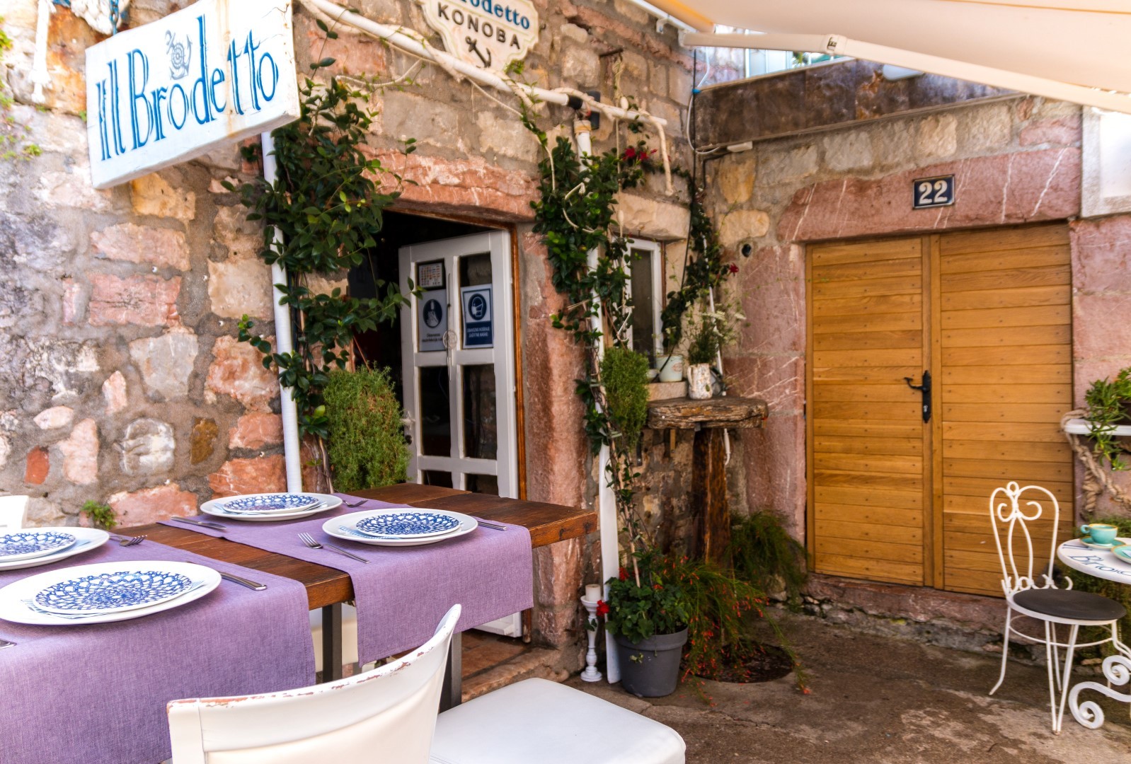Ресторан IL Brodetto Pržno — это элегантное, но неформальное место с деревянной атмосферой и характерными для рыбалки деталями.